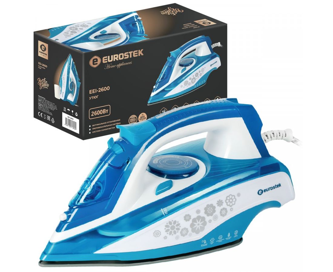 Утюг Eurostek EEI-2600, 2,6кВт, подошва керам, самоочистка, вертик отпаривание, разбрызг., синий
