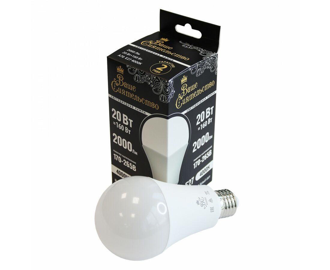 ВАШЕ СИЯТЕЛЬСТВО лампа св/д ЛОН A70 E27 20W(2000lm) 4000K 4K 140x70 матов, пласт/алюм. IC-драйвер 2г