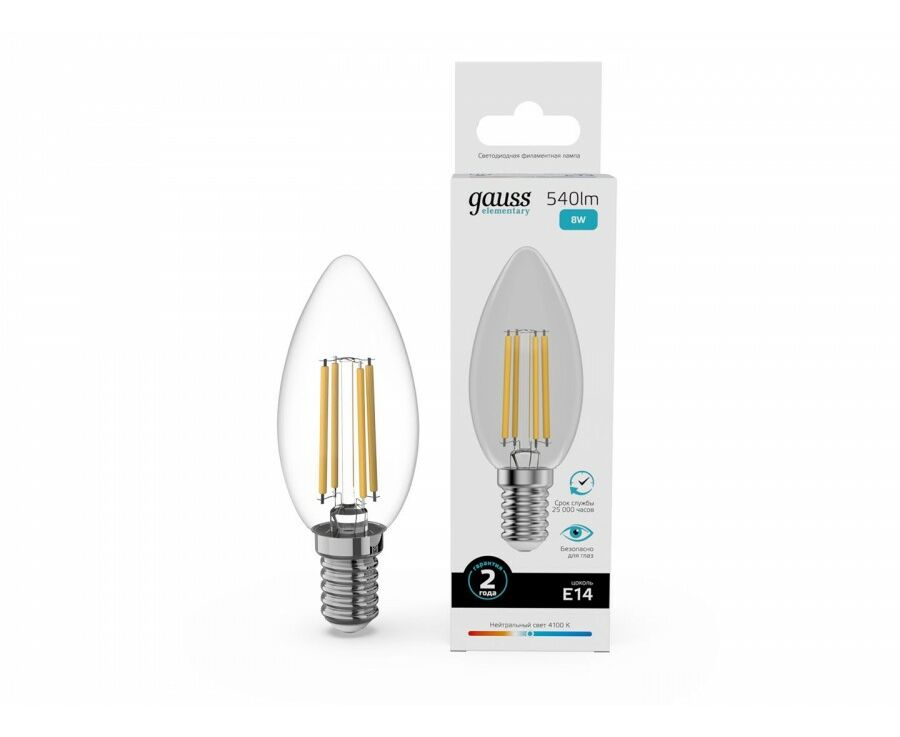 Gauss Elementary Filament Свеча Е14 8W(540lm) 4100К 98х35 прозр, стекло, нитевид 32128
