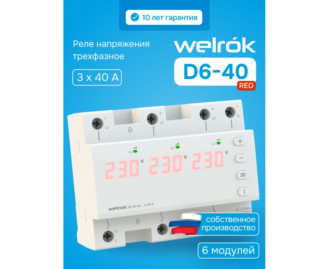 Welrok реле напряжения D6-40 red 3ф 40А 6мод, красная индикация, термозащита