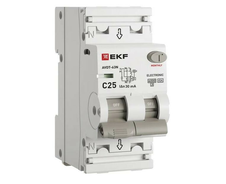 EKF PROxima дифф. автоматический выкл. АВДТ-63N 1P+N C25 30мА, тип A, 6кА, электрон. D63N26EA25C30