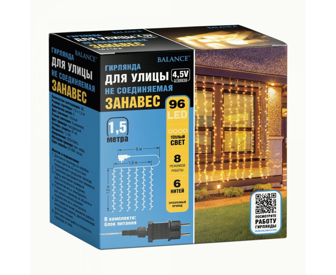 BALANCE Гирлянда-занавес 96LED теплый, 1,5*1,5м/6нит, 8 реж, прозр.провод, блок питания