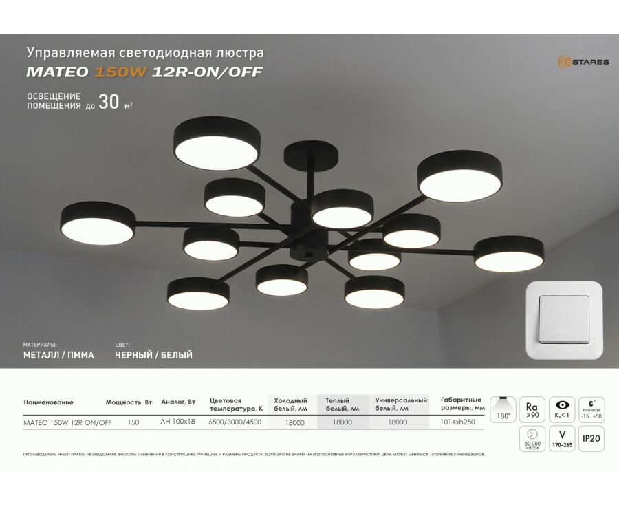 Estares св-к-люстра св/д управл. MATEO 6R 150W (15000Lm) 2K-4K-6K 1014х250 пульт ДУ черн/бел. IP20 #