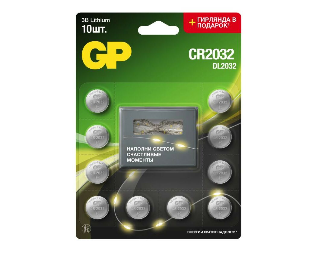 Элемент питания GP CR2032 BL10 + гирлянда в подарок (Роса 2м 20LED, 2x2032)