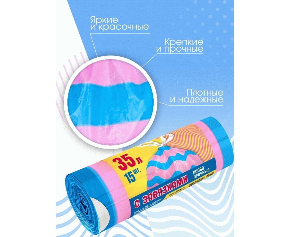 Мешки для мусора 35л/15шт,20мкм,ПСД,завязки,голуб/роз,рулон,особопрочн,Полосатики,40196/ Avikomp