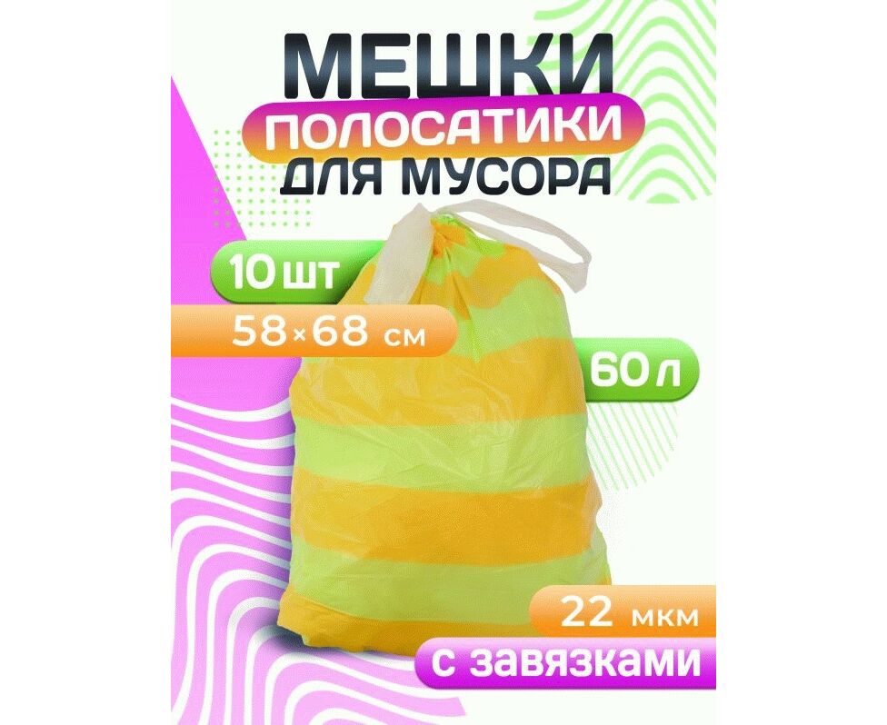Мешки для мусора 60л/10шт,22мкм,ПСД,завязки,желт/зел,рулон,особопрочн,Полосатики,40226/ Avikomp