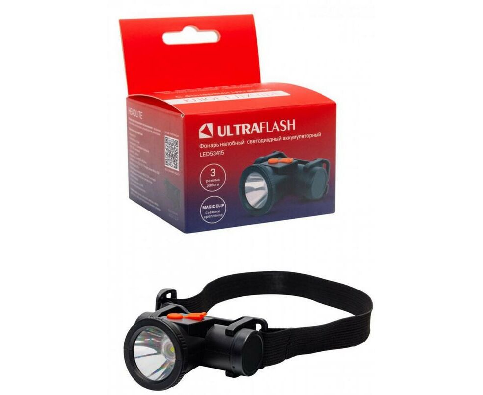 Ultraflash фонарь налобный+ручной LED53415 (акк.4V) 1W(50lm) 3 реж, кроншт MagicClip, черн/пласт USB