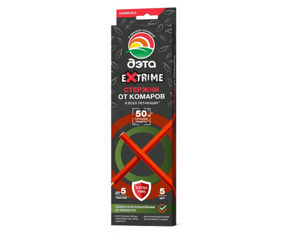 Стержни ДЭТА EХЕTRIME – дополнительное время для активного отдыха. Для тех, кто выбирает активный отдых, наполненный незабываемыми открытиями и яркими эмоциями. Именно для того, чтобы отдых на природе приносил только запланированные эмоции и адреналин, необходимо заранее задуматься о современных средствах защиты. Стержни эффективно и быстро справятся с насекомыми даже в местах их большого скопления, они удобны и просты в использовании, не ломаются и легко устанавливаются. Для обеспечения комплексной защиты во время активного отдыха рекомендуется использовать в сочетании со средствами индивидуальной защиты ДЭТА EXTRIME. Средства серии специально созданы для экстремальных условий, они имеют максимальную эффективность и длительность действия. Время полного сгорания стержня в отсутствие ветра – до 4 ч. Площадь защиты в сухую безветренную погоду - до 50м?. Способ применения: вскрыть упаковку, достать стержень, установить конец стержня в бутылку или воткнуть в землю на открытом воздухе (сад, приусадебный участок, беседки, открытые террасы, веранды, балконы), в помещении установить стержень в вертикальном положении на негорючую подложку. Стержень поджечь, через 30 с устойчивого горения пламя задуть. Средство размещать на расстоянии не менее 1 м от человека с наветренной стороны. Действие средства начинается через 10-15 мин после начала тления. В помещениях (склады, подвалы, домики рыбака, туриста, кемпинги, палатки) средство применяют в отсутствие людей. Норма расхода на помещение объемом 25 м? составляет 1ч тления стержня. По окончании обработки тлеющий стержень затушить. Площадь защиты одного стержня в сухую безветренную погоду - до 25м?. Для комфортного пребывания на открытом воздухе при большом скоплении насекомых рекомендуется применять не менее 2-х стержней. После применения вымыть руки с мылом.