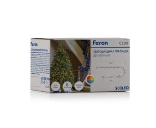 Гирлянда линейная FERON CL09, 500LED, (мультиколор), настраивается контроллером, 10м+2м зеленый шнур, расстояние между светодиодами 2см, IP20, 30W, от сети 230V, последовательное подключение - НЕТ