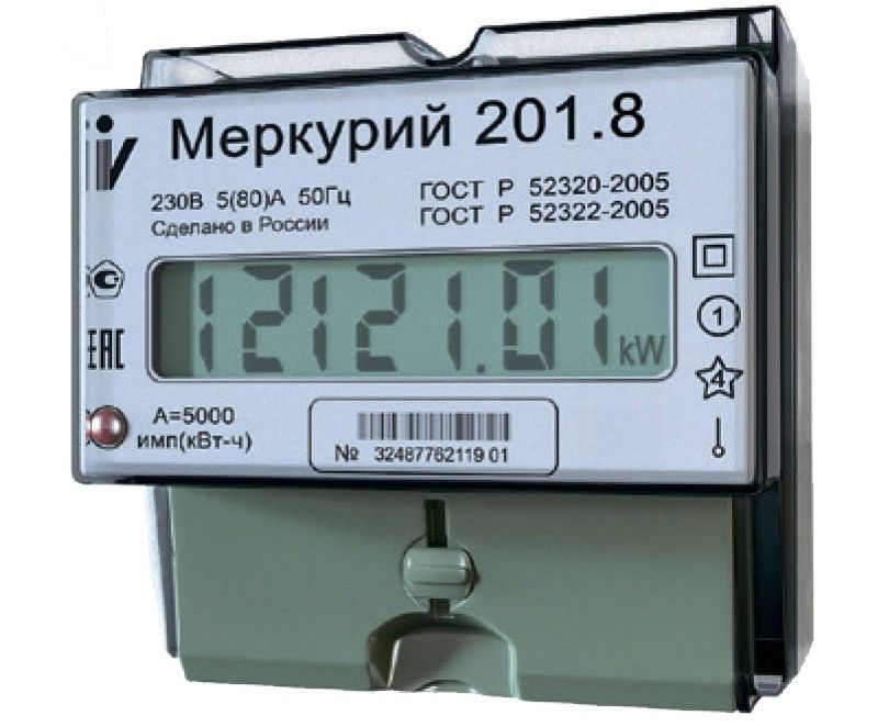 Меркурий 201.8 счетчик эл/эн 1ф 1т 5(80)А, 6-ти разр. ЭМОУ ЖК для уст. на рейку (без планки) 2020 (604216)